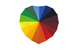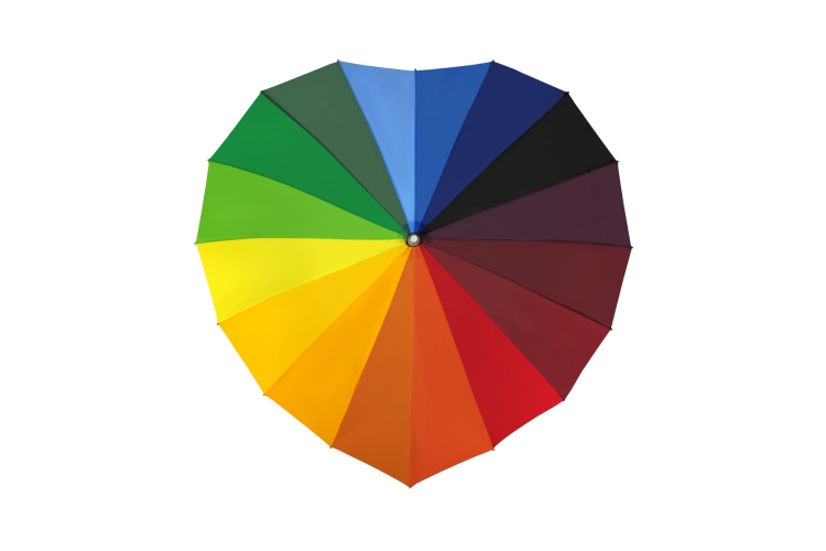 LR-9 FALCONE paraplu, hartvormig in regenboogkleuren, windproof, aluminium stok, glasfiber frame, rood gekleurd EVA handvat.
