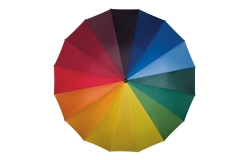 LR-80-823 FALCONE paraplu, 16 banen, regenboogkleuren, zwart glasfiber frame, 14 mm houten stok en haak.