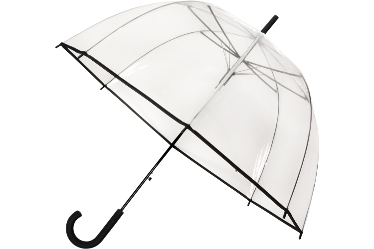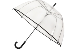 LA-26 FALCONETTI koepelparaplu, automaat, baleinen zwart metaal/glasfiber, 8 mm zwart metalen stok, wit transparant POE, zwarte kunststof haak en tips.