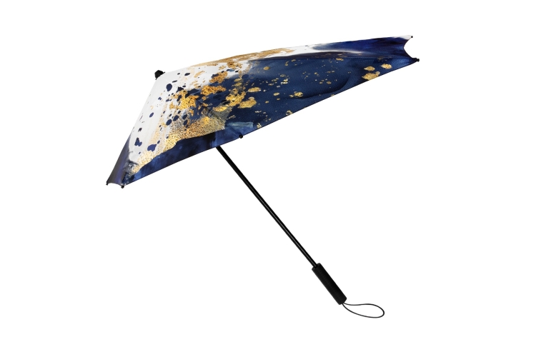 De aërodynamische stormparaplu met de brede achterkant voor maximale bescherming tegen regen.